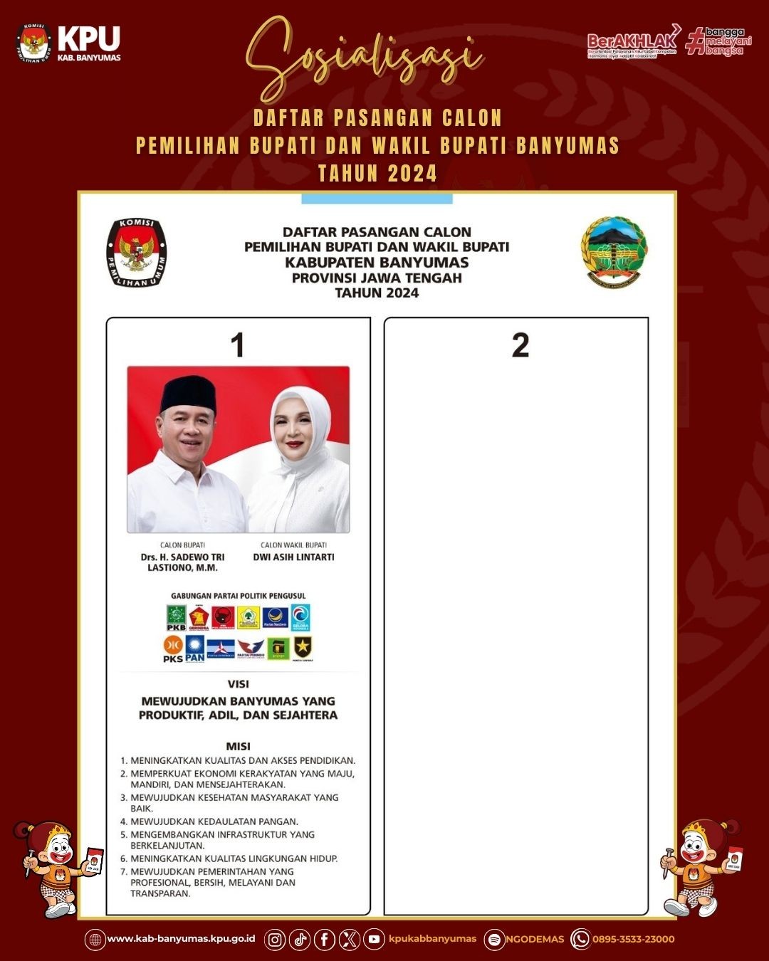KPU Kabupaten Banyumas telah Penetapan Nomor Urut Pasangan Calon Peserta Pemilihan Bupati dan Wakil Bupati Banyumas Tahun 2024 melalui Surat Keputusan KPU Kabupaten Banyumas Nomor: 1539 Tahun 2024 tentang Penetapan Nomor Urut Pasangan Calon Peserta Pemilihan Bupati dan Wakil Bupati Banyumas Tahun 2024, untuk Pasangan Calon Nomor Urut 1 dan untuk Kolom Kosong tidak bergambar Nomor Urut 2.