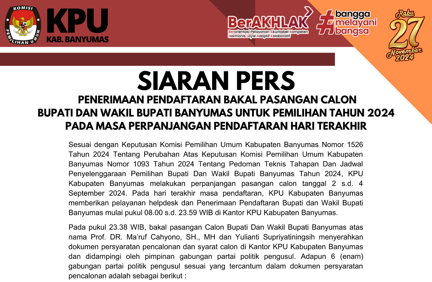 Siaran Pers Penerimaan Pendaftaran Bakal Pasangan Calon Bupati Dan Wakil Bupati Banyumas Untuk Pemilihan Tahun 2024 Pada Masa Perpanjangan Pendaftaran Hari Terakhir