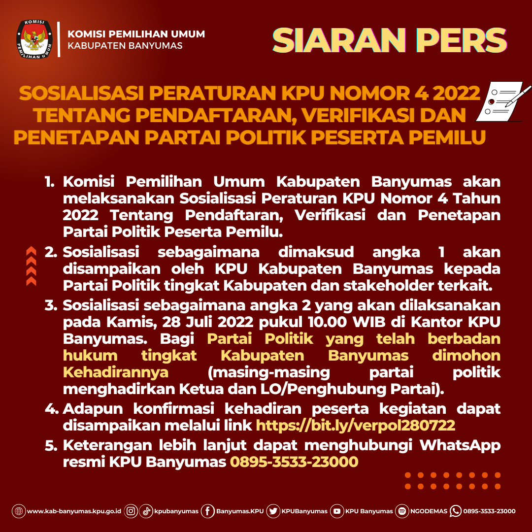 KPU Kabupaten Banyumas akan menyelenggarakan Rapat Koordinasi dan Sosialisasi Peraturan KPU No 4 Tahun 2022 Tentang Pendaftaran, Verifikasi dan Penetapan Partai Politik Peserta Pemilu pada Kamis, 28 Juli 2022, Selengkapnya dapat dilihat pada gambar berikut ini.