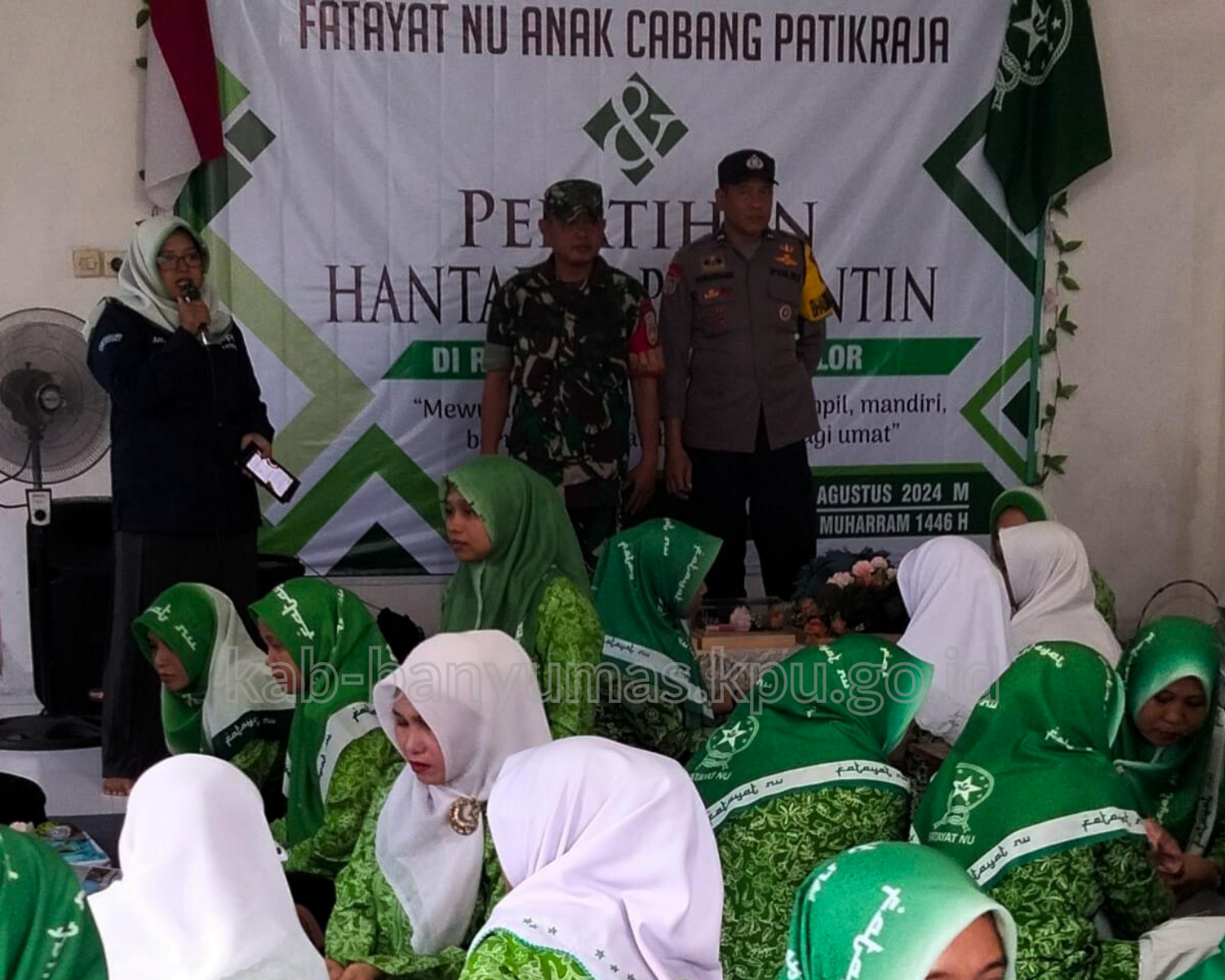 PATIKRAJA - Panitia Pemilihan Kecamatan (PPK) Patikraja memberikan sosialisasi tahapan pilkada 2024 di acara Pelatihan Hantaran Pengantin dari Fatayat Nahdlatul Ulama (NU) Anak Cabang Patikraja di Desa Kedungwuluh Lor. Kegiatan ini dihadiri oleh Segenap Forum Koordinasi Pimpinan di kecamatan (Forkopimcam), Badan Amil Zakat Nasional (Baznas), Majelis Wakil Cabang Nahdlatul Ulama (MWC NU), Pimpinan Anak Cabang (PAC) Muslimat Nahdlatul Ulama (NU) Patikraja, Bintara Pembina Desa (Bhabhinsa), Bhayangkara Pembina Keamanan dan Ketertiban Masyarakat (Bhabhinkamtibmas) desa Kedungwuluh Lor pengurus PAC Fatayat NU dan kader Fatayat Sekecamatan Patikraja, serta Bhabinkantibmas, dengan jumlah total peserta hampir 125 peserta peserta pada hari Jumat, (2-08-2024)